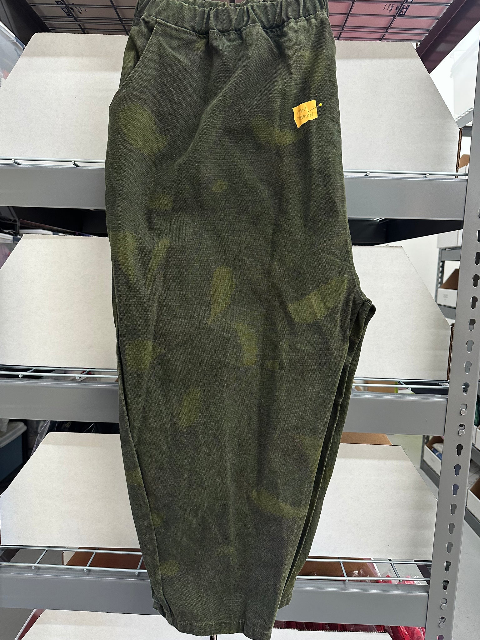 These pants are peek niche Nettle. You might recognize this material from a long long time ago. We took this vintage Hungarian camo and overdyed it for a moody, modern feel and used every remaining thread to make these pants!