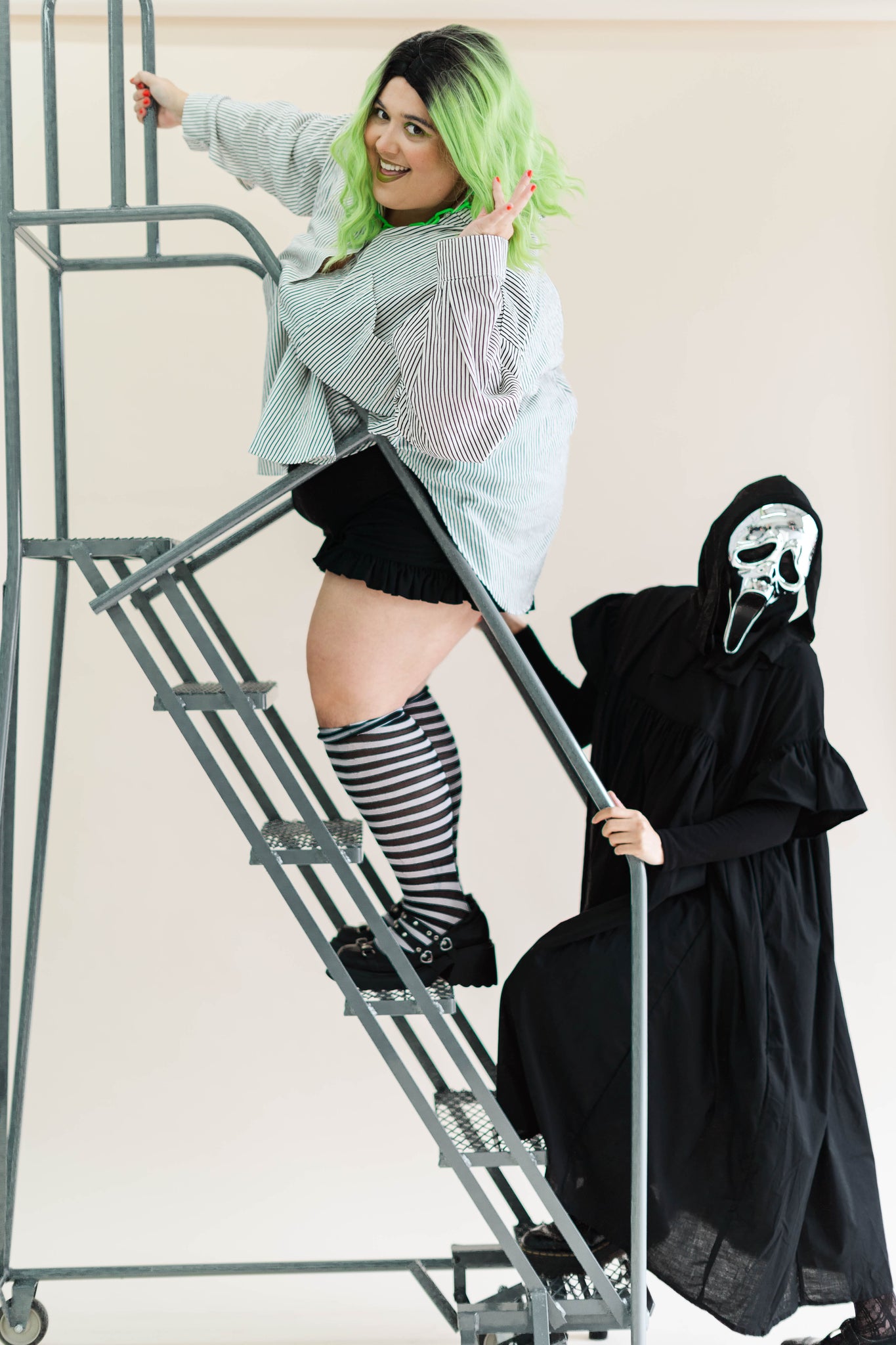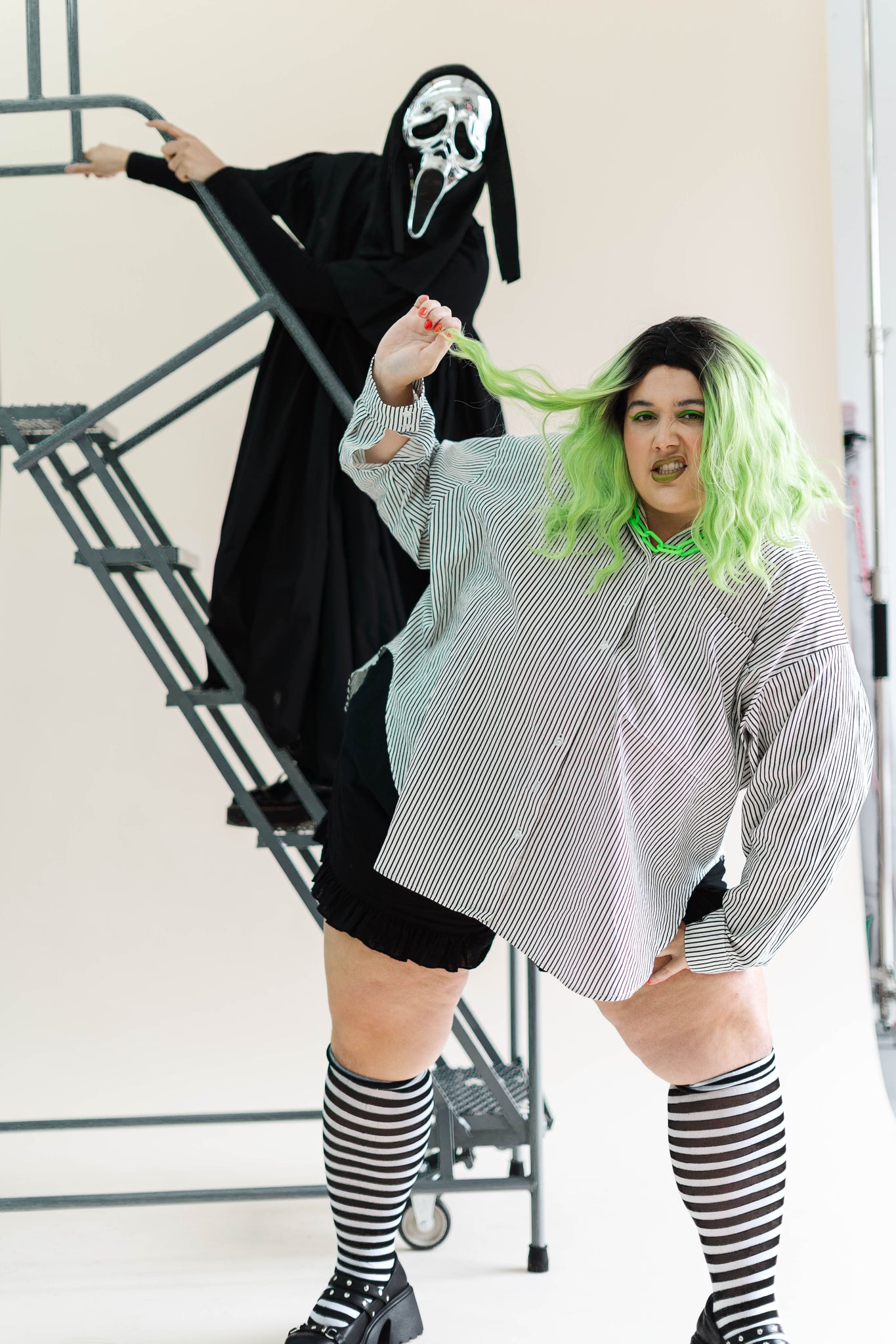 MODEL Madison (they/she) is 5'7" with a 28.5” inseam and measures 35” bust, 26.5” waist, and 37.5” hips. Dimple is 5'7" with a 33" inseam and measures 37" bust, 30" waist, and 41" hip. Angelina is 5'7" with a 29” inseam and measures 58” bust, 47” waist, 60” hips, and wears a 44DD Bra.