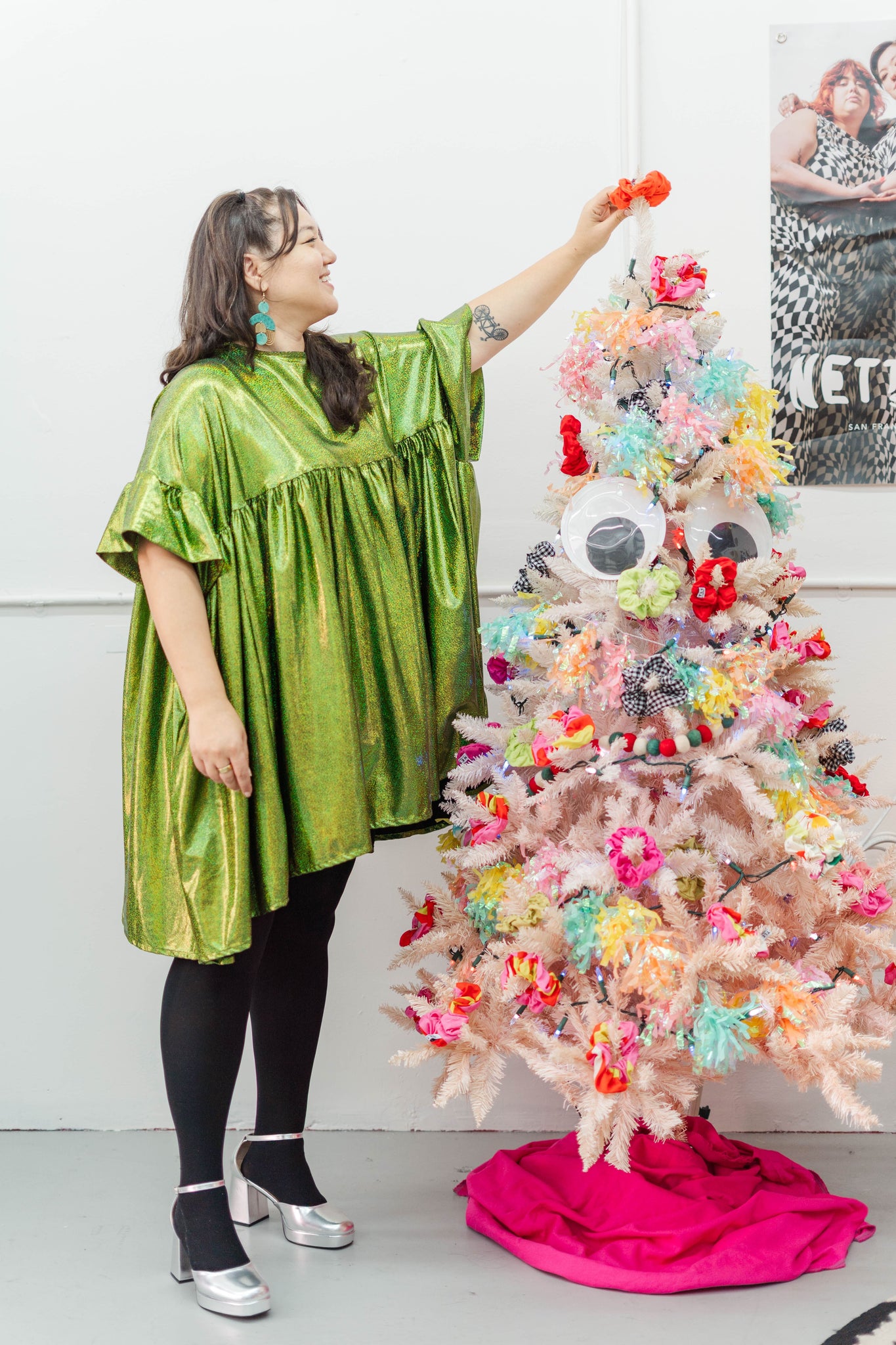 Glamour Meets Comfort Drenched in holographic green glitter, this dress is loose, swishy, and secretly comfy, with a soft drape that catches every bit of light. It’s full-on disco ball energy with sweatshirt-level ease—no fuss, just pure, sparkling magic. ✨