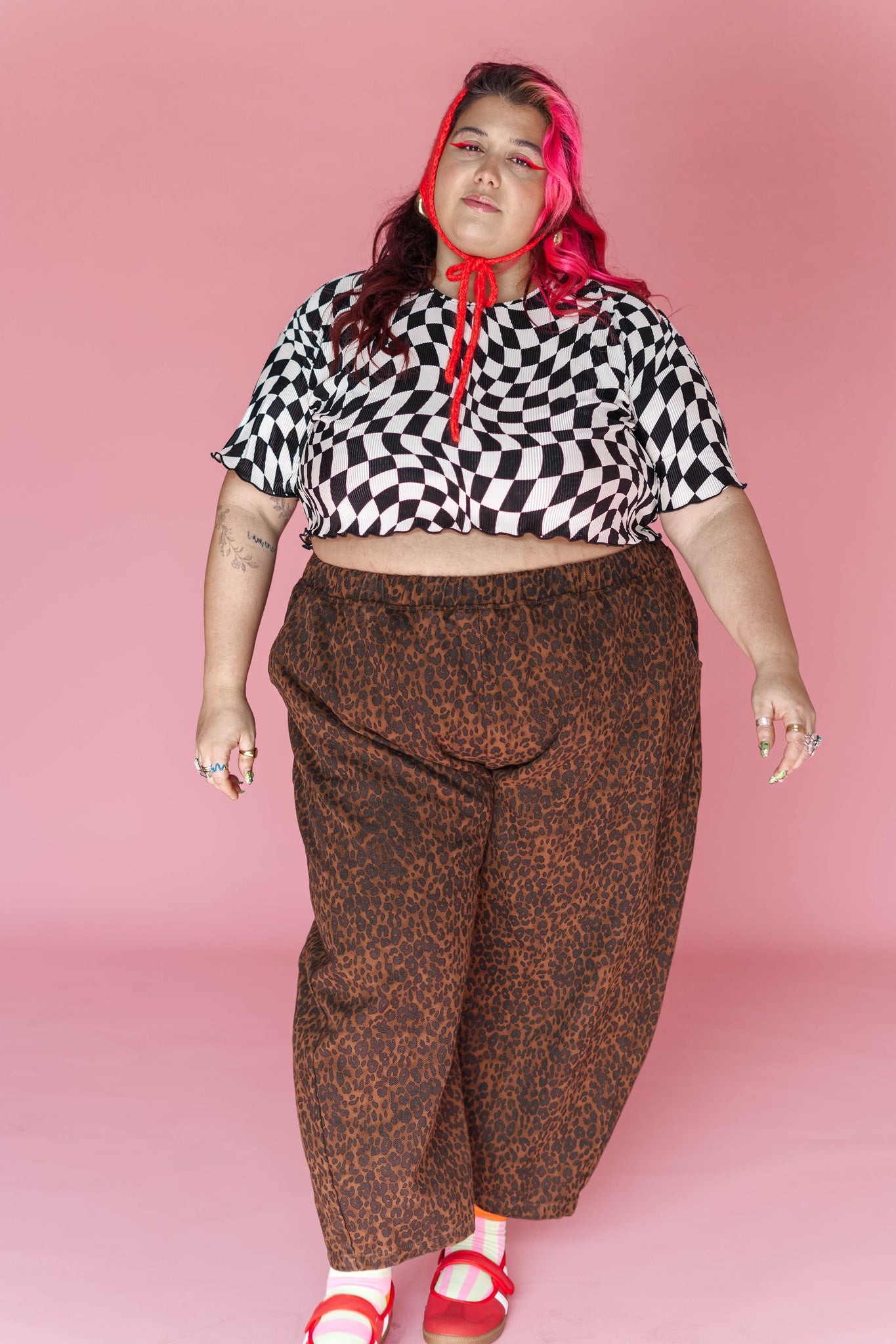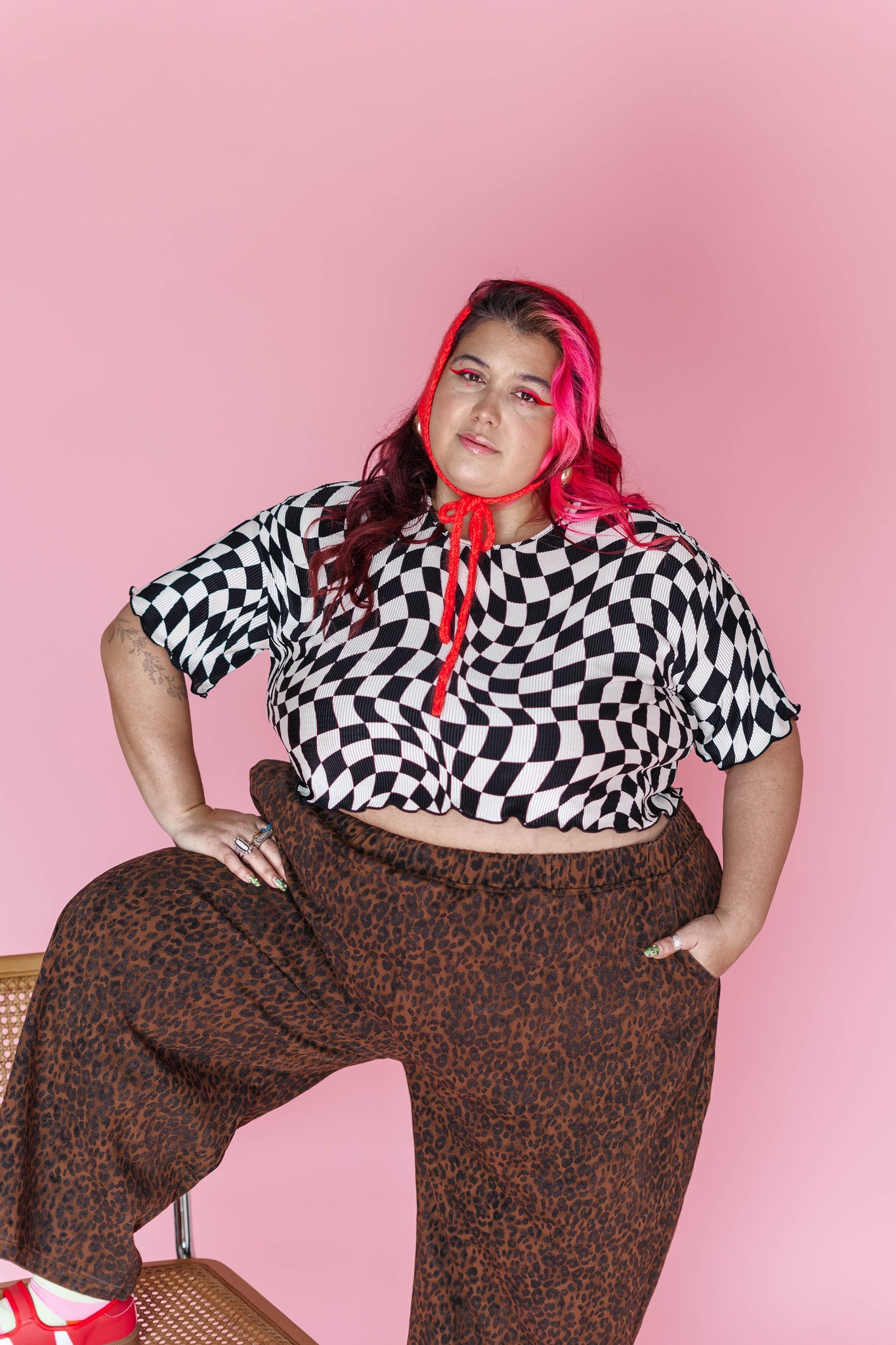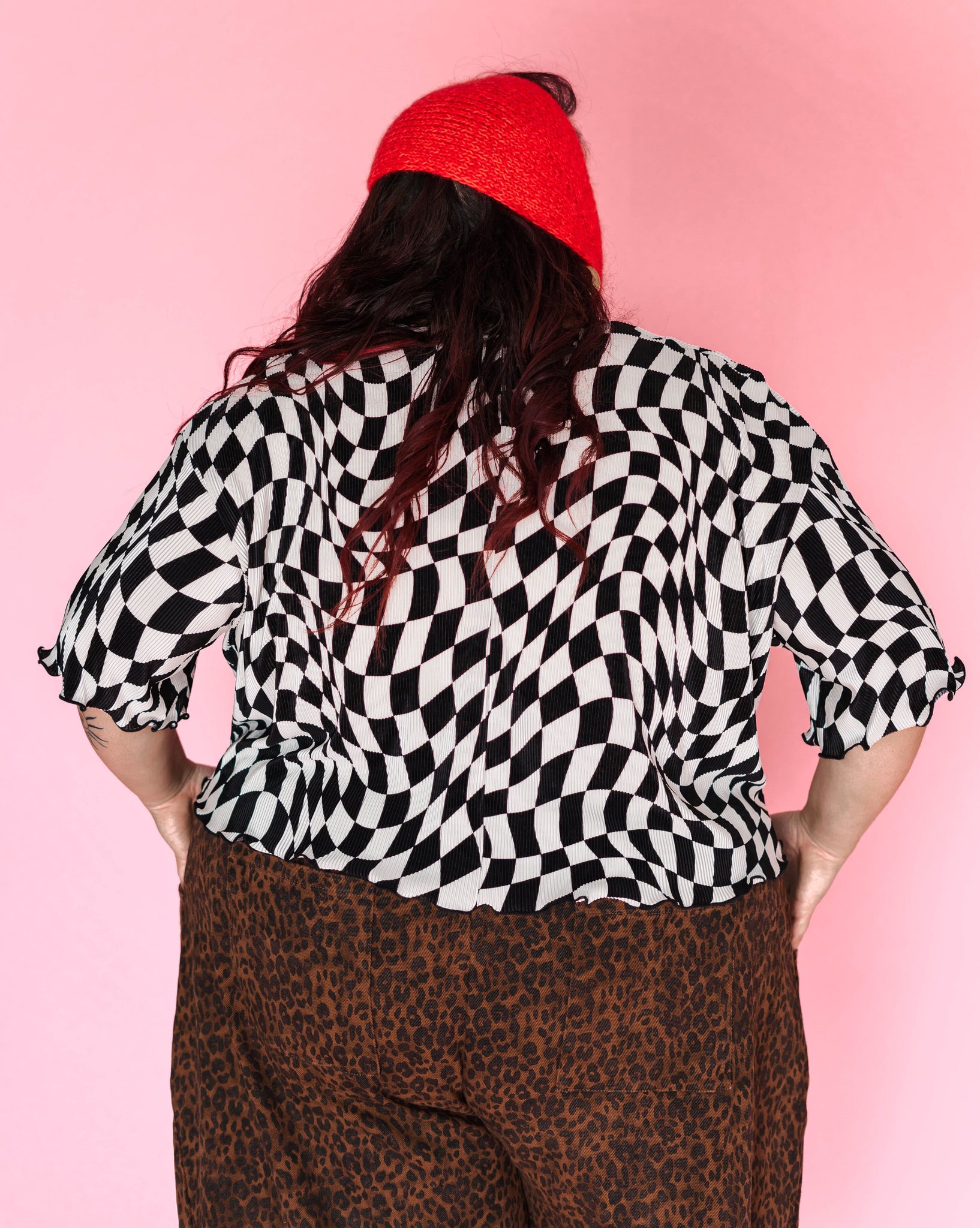 Wiggly Checkers: Instead of tidy little squares, this print goes full funhouse. The checks are warped, wavy, and a tiny bit trippy—some areas bend more than others, and that irregular vibe is exactly what we love about it. It looks like it’s gently in motion even when you’re standing still.