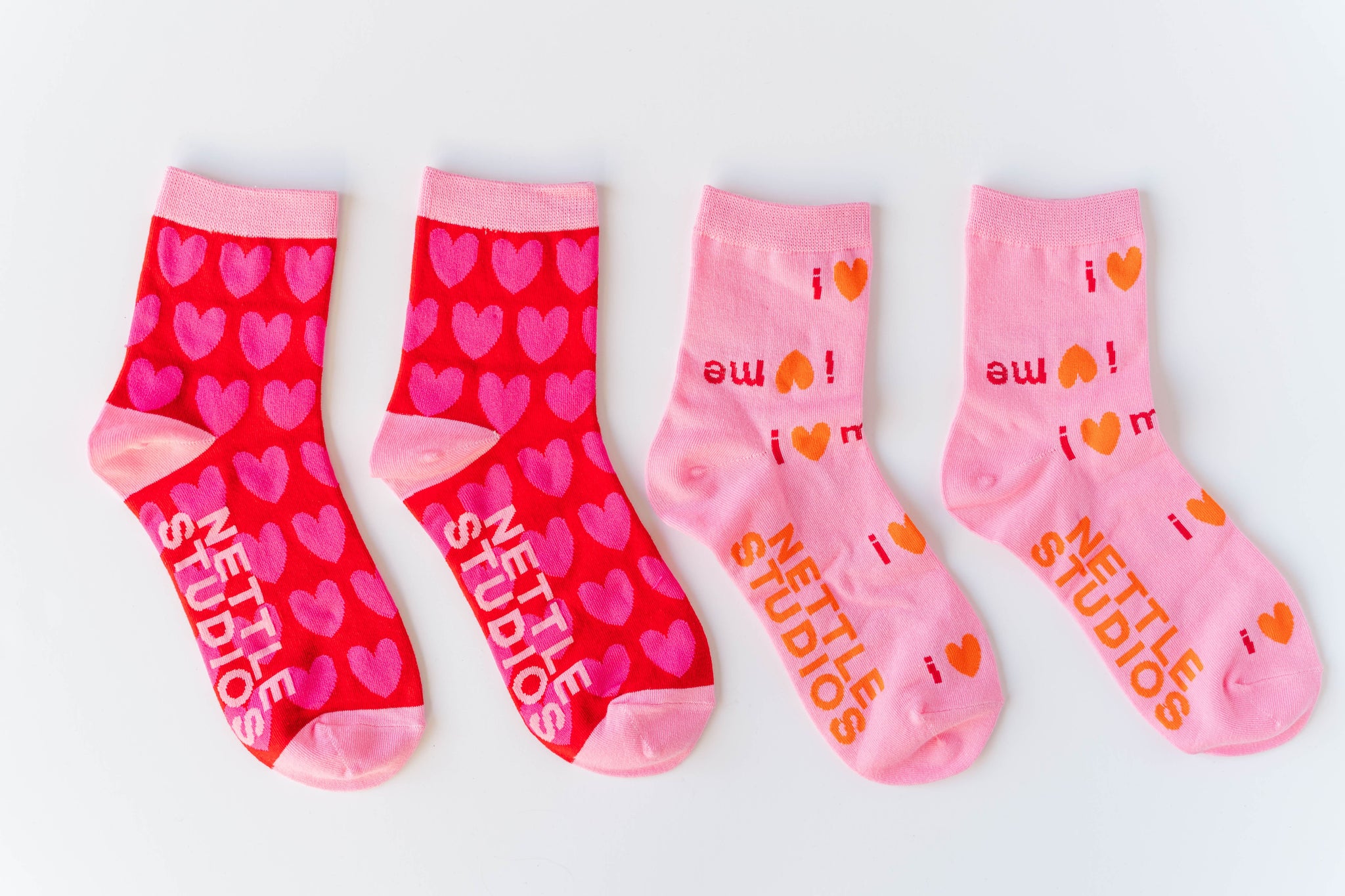 Four pairs of colorful socks with 'Nettle Studios' branding on a white background