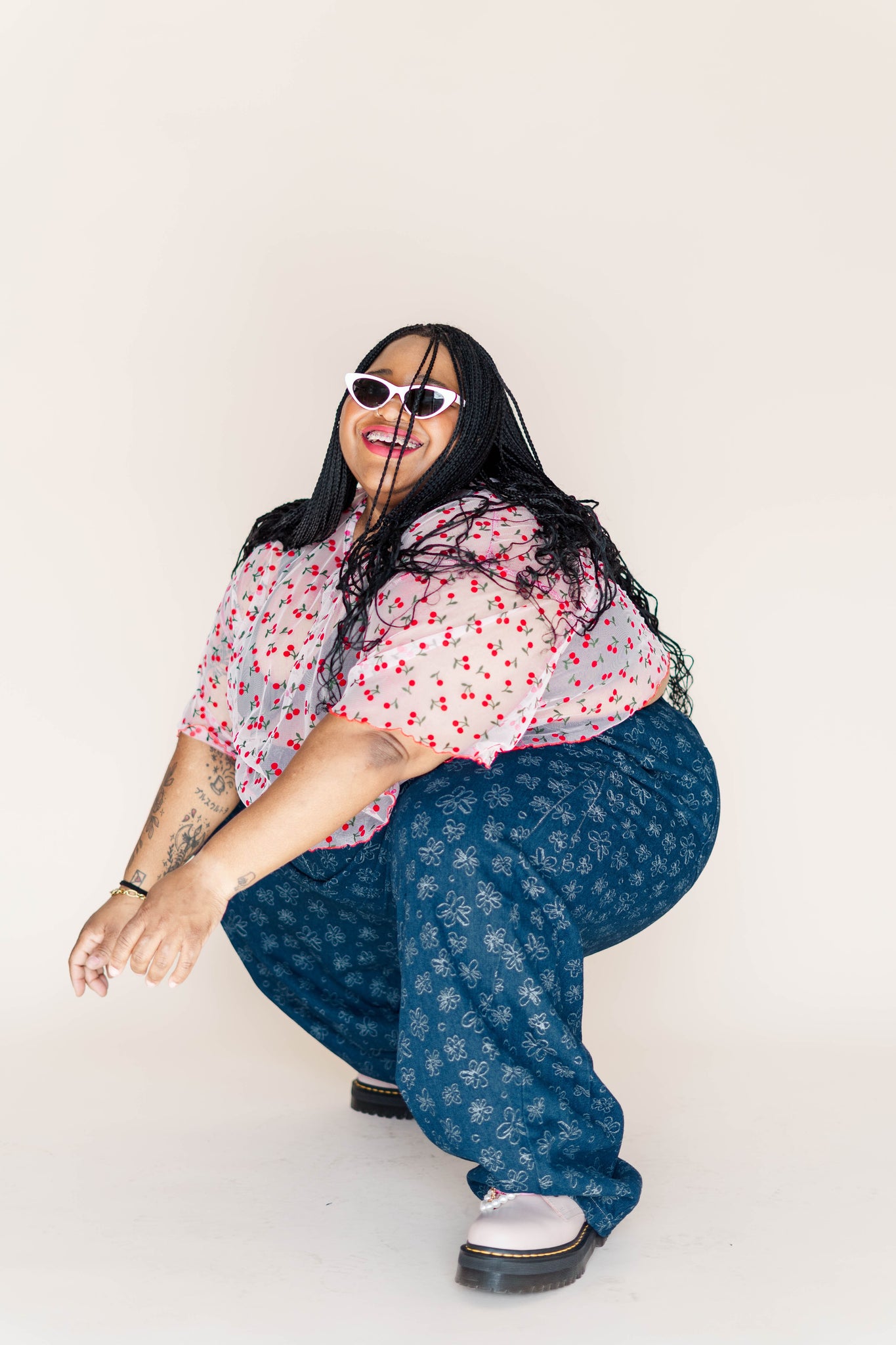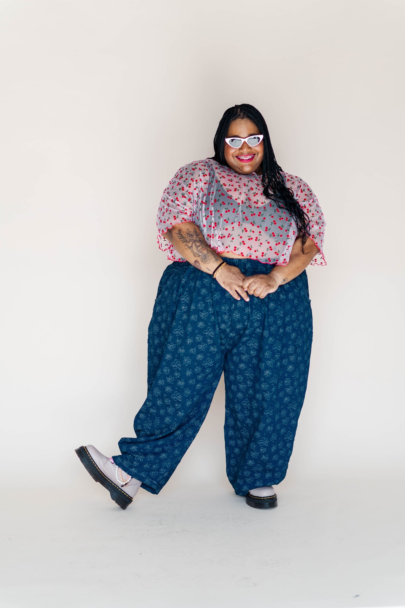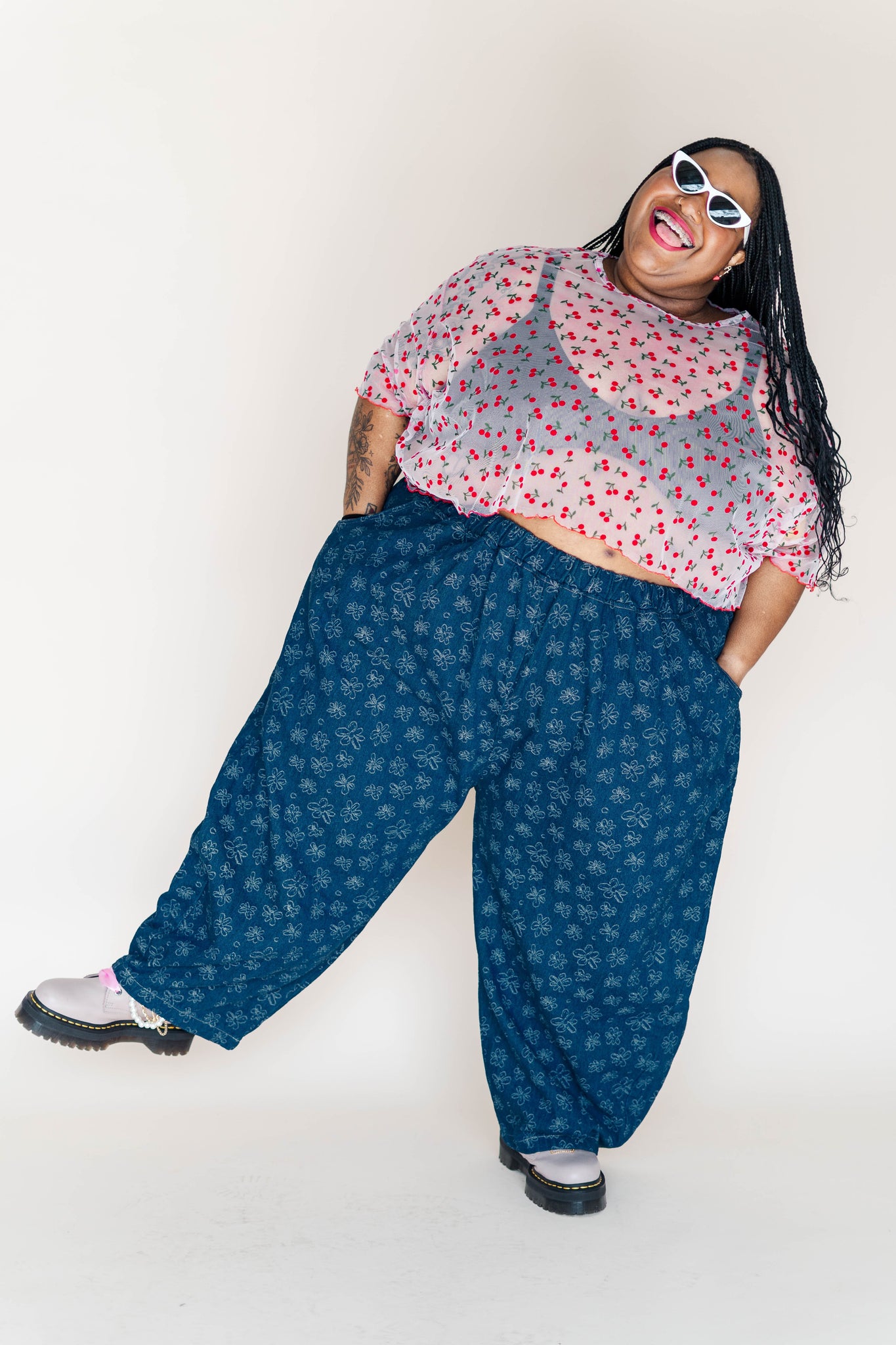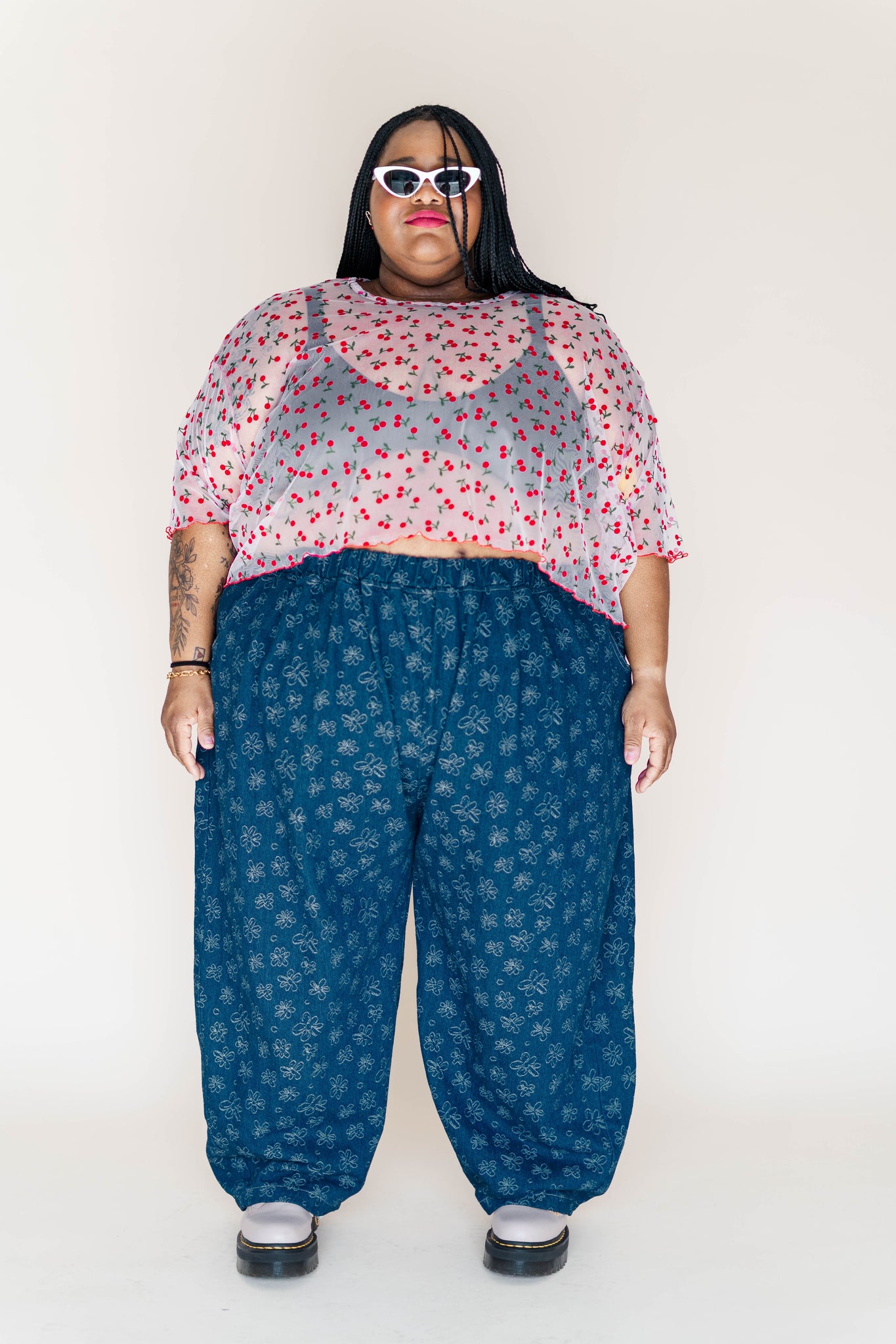 This version is made in a sheer clear mesh with embroidered cherries and a red lettuce hem on the sleeves and bottom. Lightweight, breathable, and very cheeky.