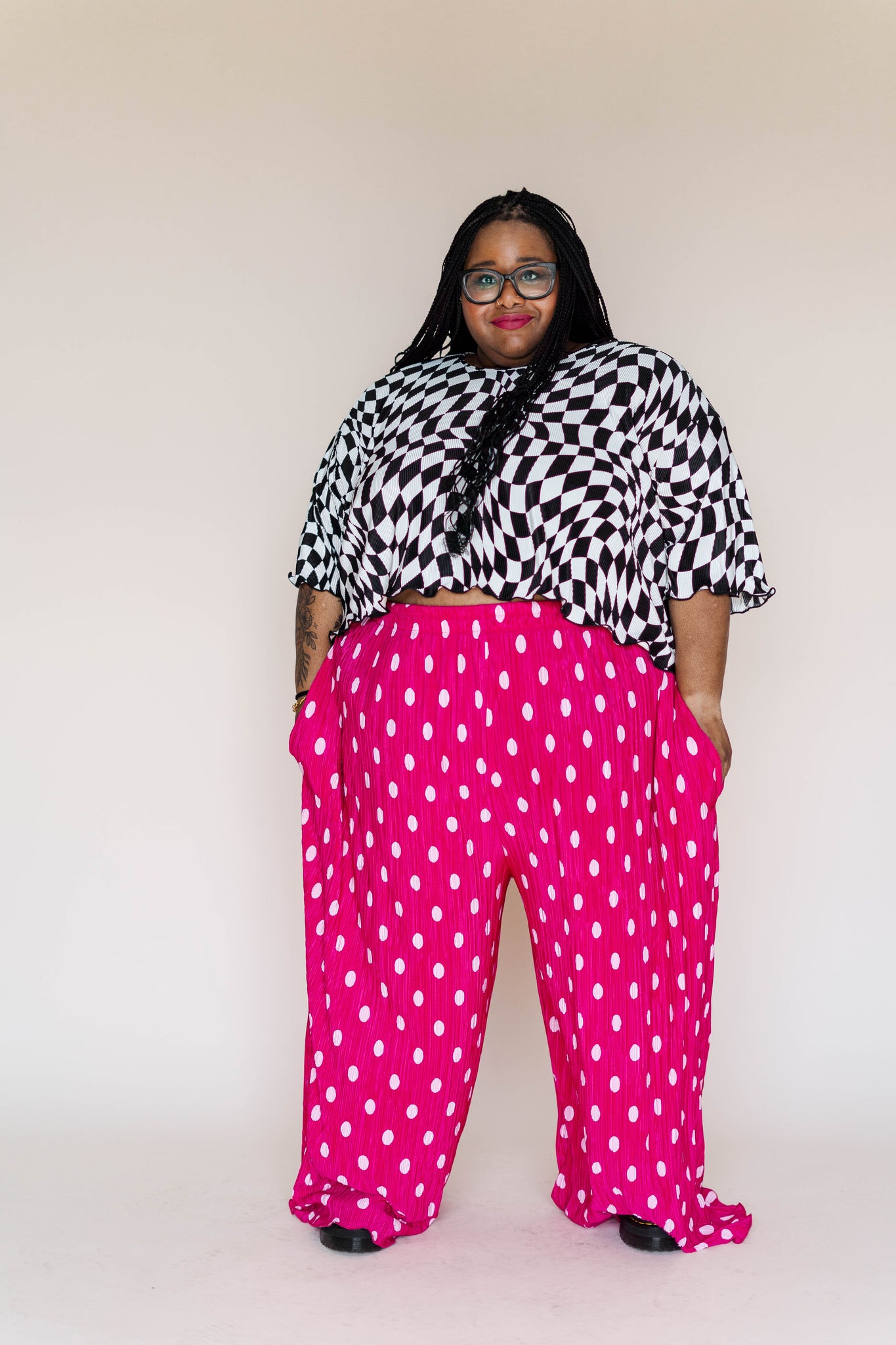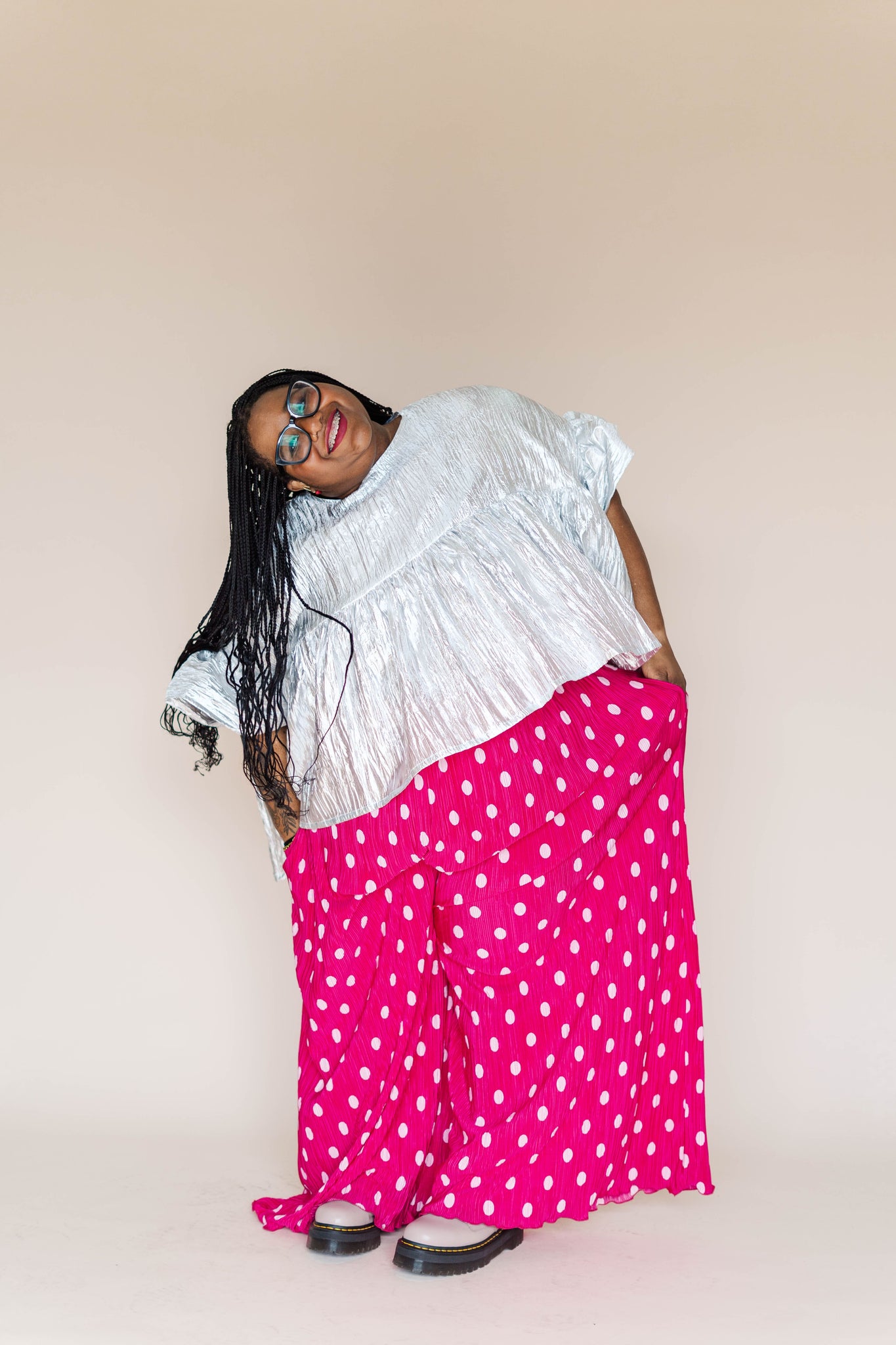 FIT Keda is wearing a 3XL with the Endive Button Mushroom Top and Black Crinkle Mushroom Top and a 4XL with the Dizzy Tee and Silver Mushroom Top. Angelina is wearing a 2XL.Ā