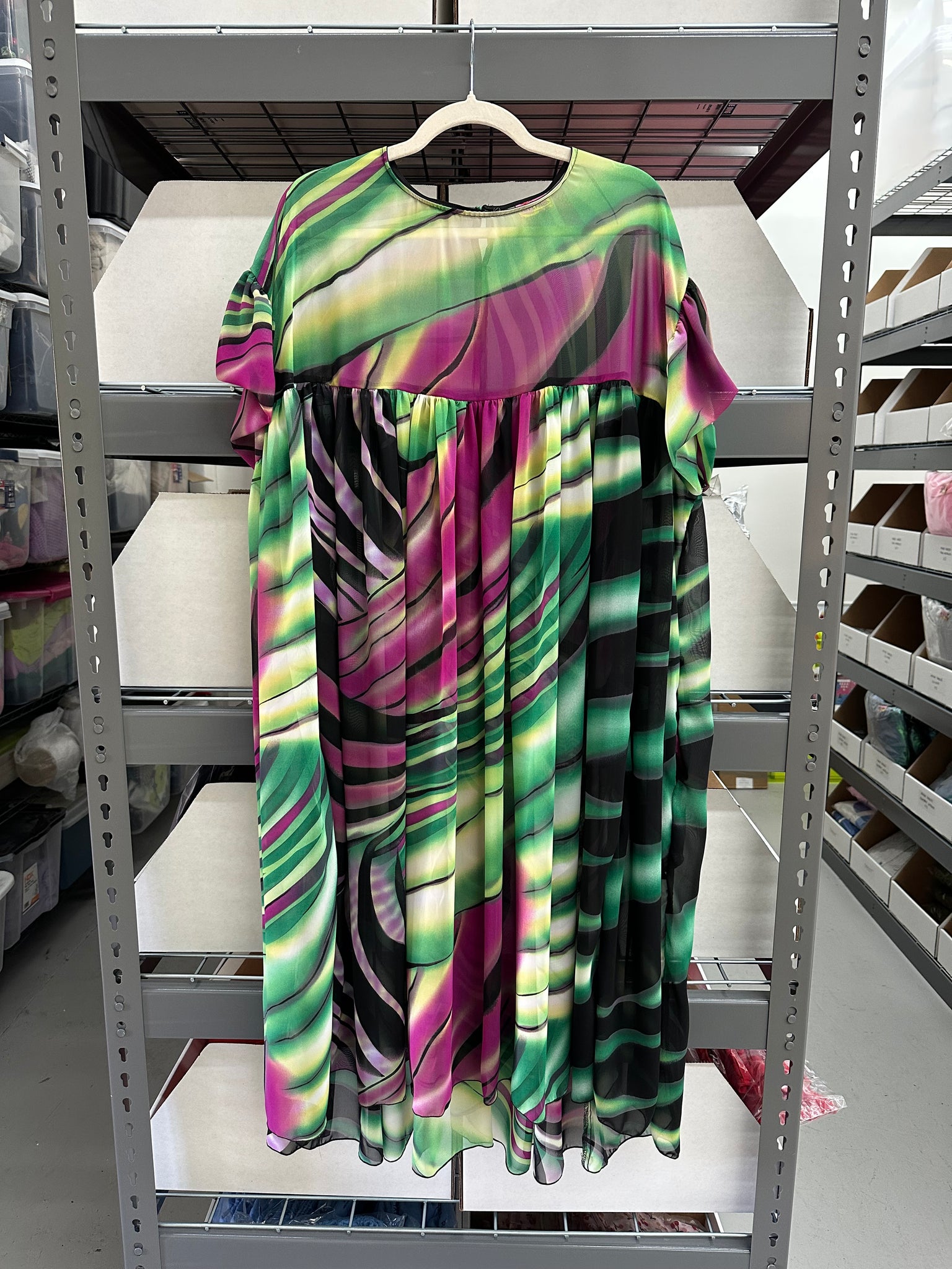 Glamour Meets Comfort: Draped in shimmering green/black metallic, this dress is flowy, luxe, and perfectly effortless with a sheer, holographic effect that adds a hint of allure. It’s all the glam without the fuss—just pure, sparkling magic!