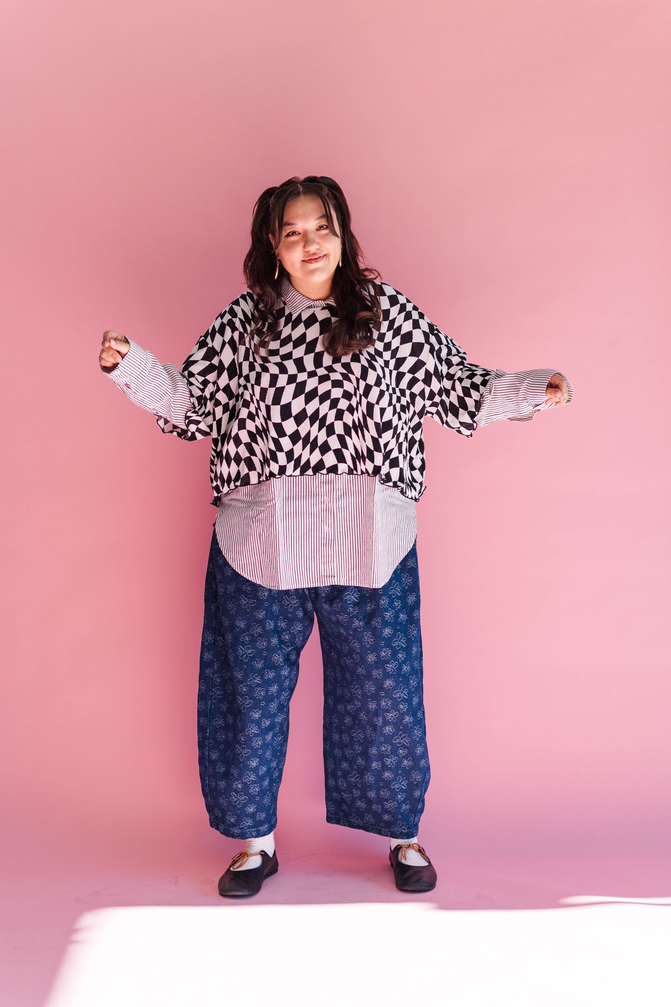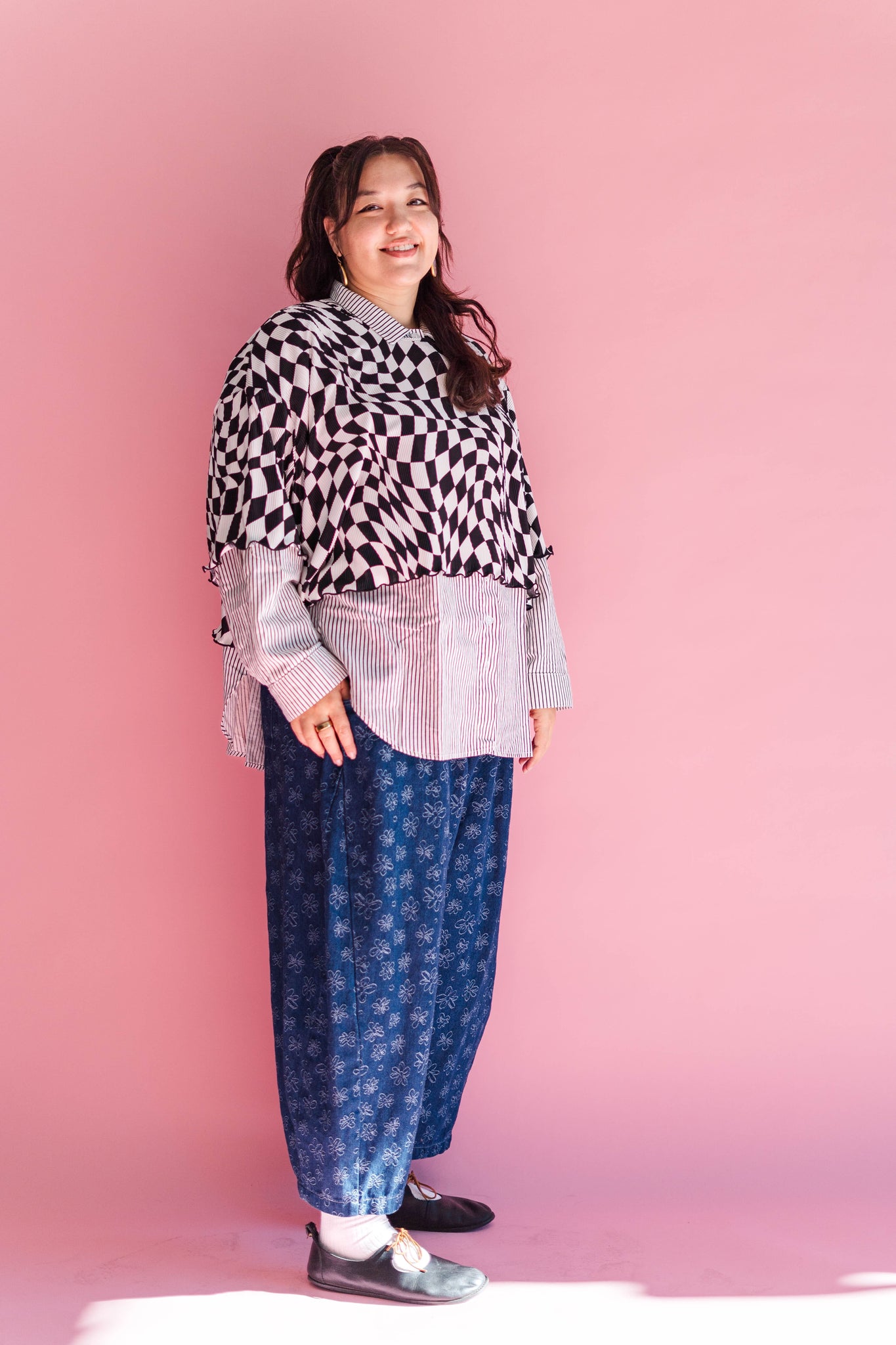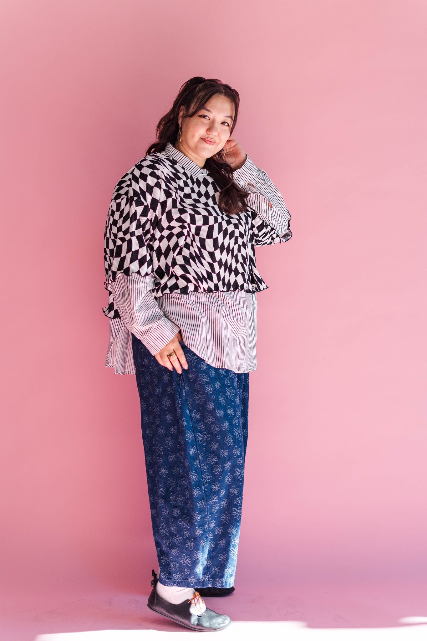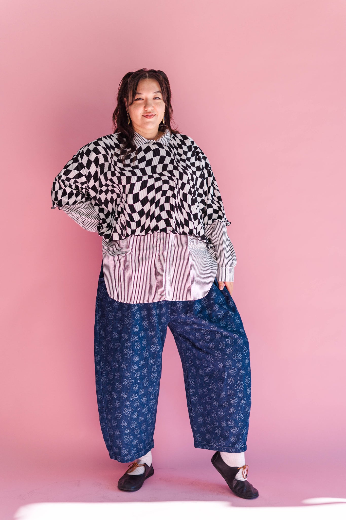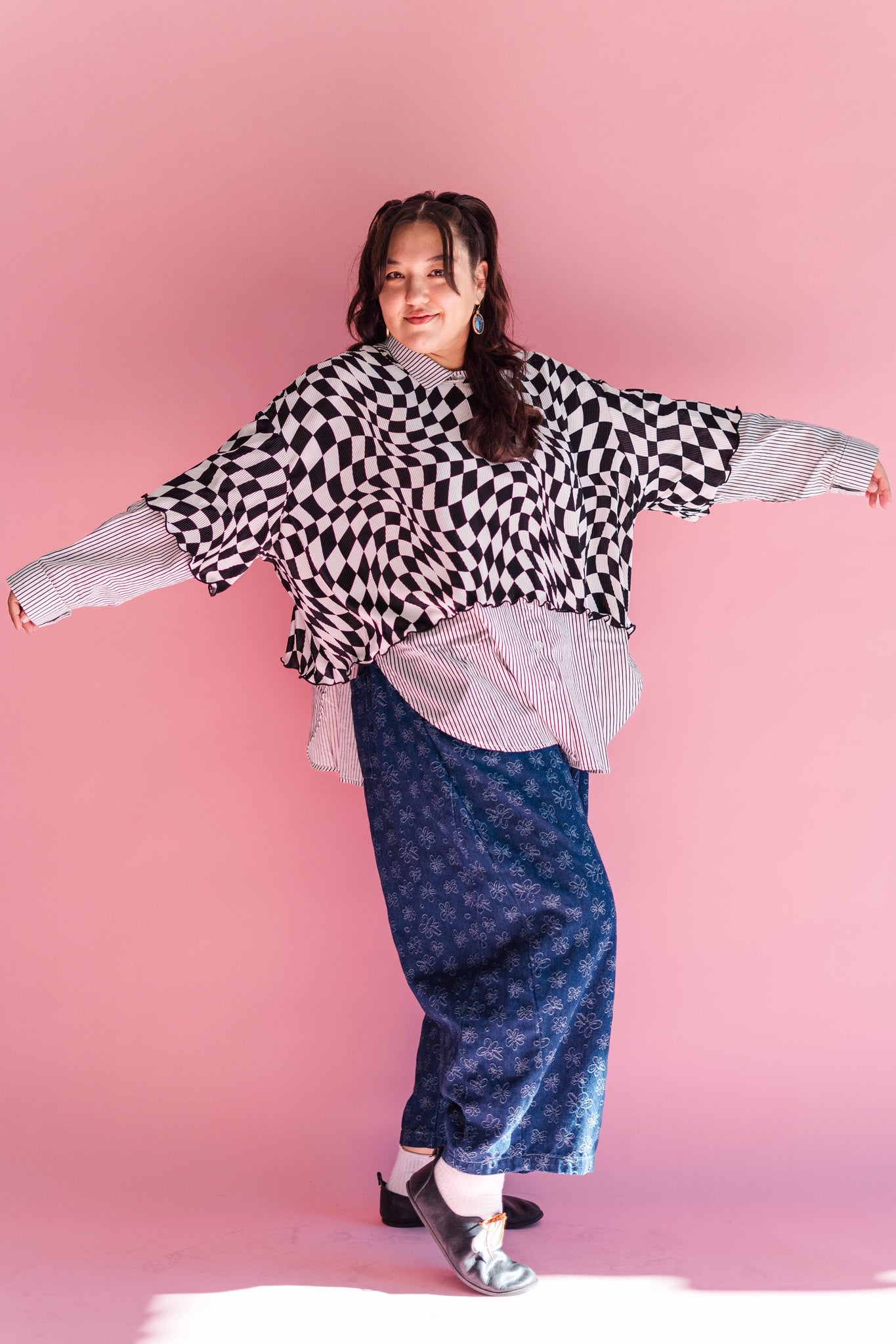 Wiggly Checkers: Instead of tidy little squares, this print goes full funhouse. The checks are warped, wavy, and a tiny bit trippy—some areas bend more than others, and that irregular vibe is exactly what we love about it. It looks like it’s gently in motion even when you’re standing still.