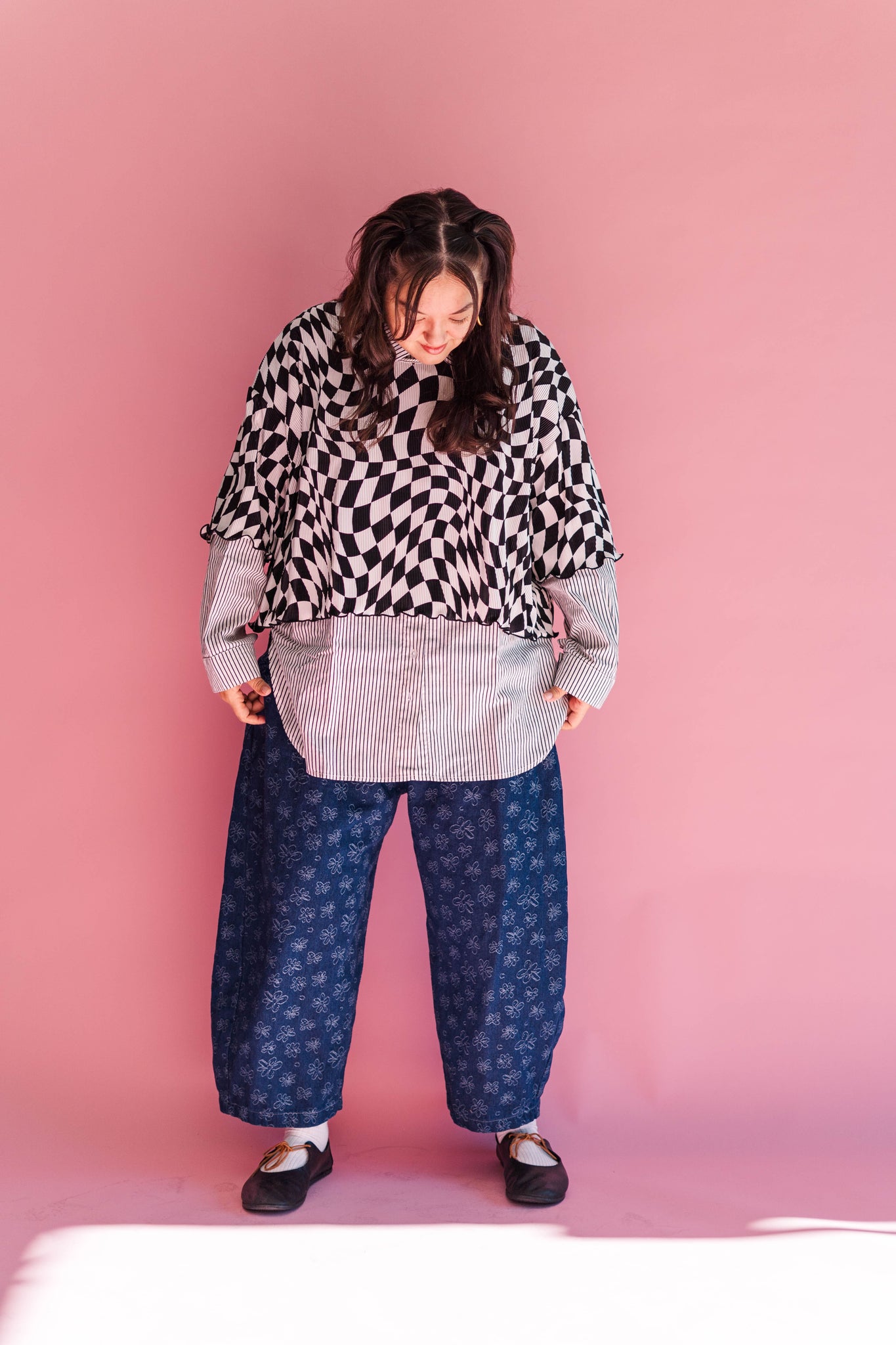 Now it’s back in a wiggly checkered Nettle deadstock we’ve had lounging around the studio since 2021, just waiting for another moment to shine. The same easy, throw-on shape you love, now in a trippy black-and-white checker that looks like it’s dancing while you walk.