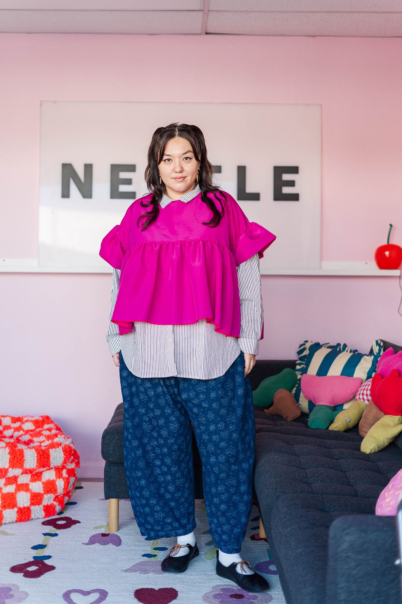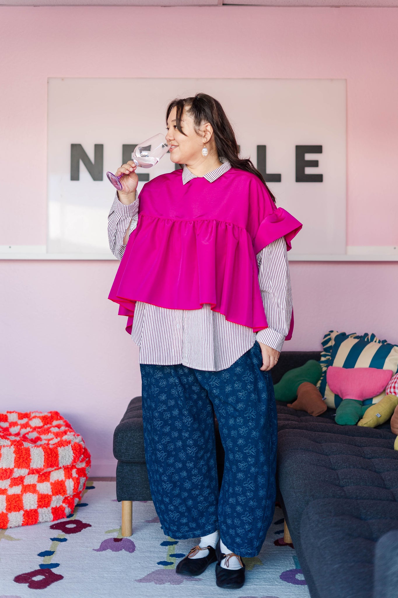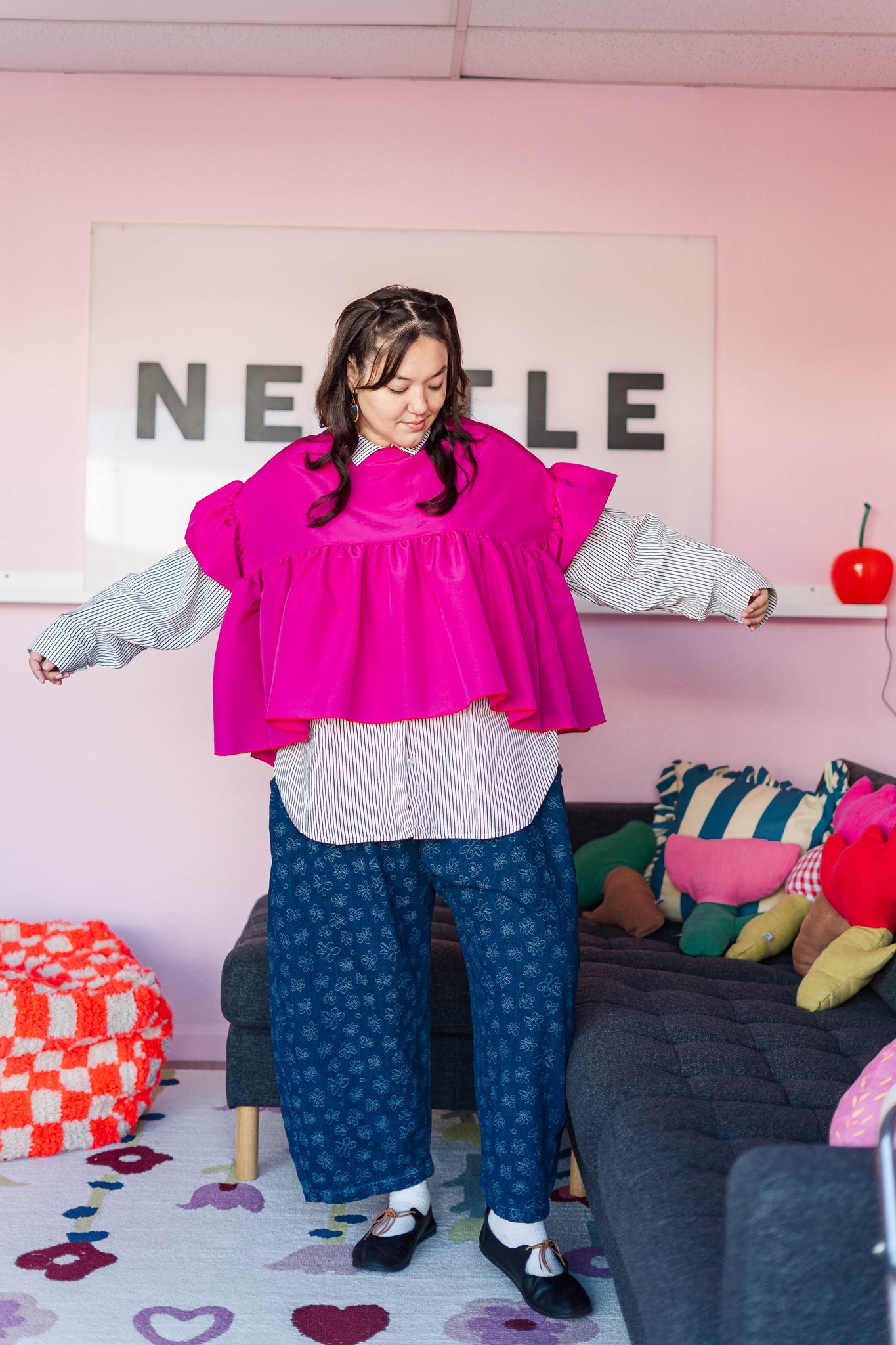 This time, we rescued the fabric straight from the factory floor. When brands close, they usually leave their deadstock and leftover fabric behind—perfectly good rolls, abandoned for years… until we find them. We’re not sure which brand this came from, but it was hiding under a cutting table for literal years.