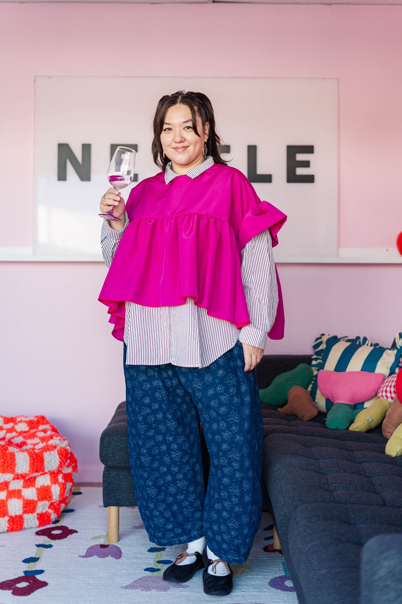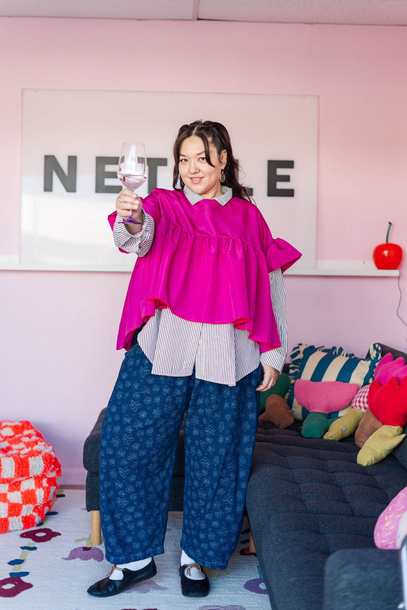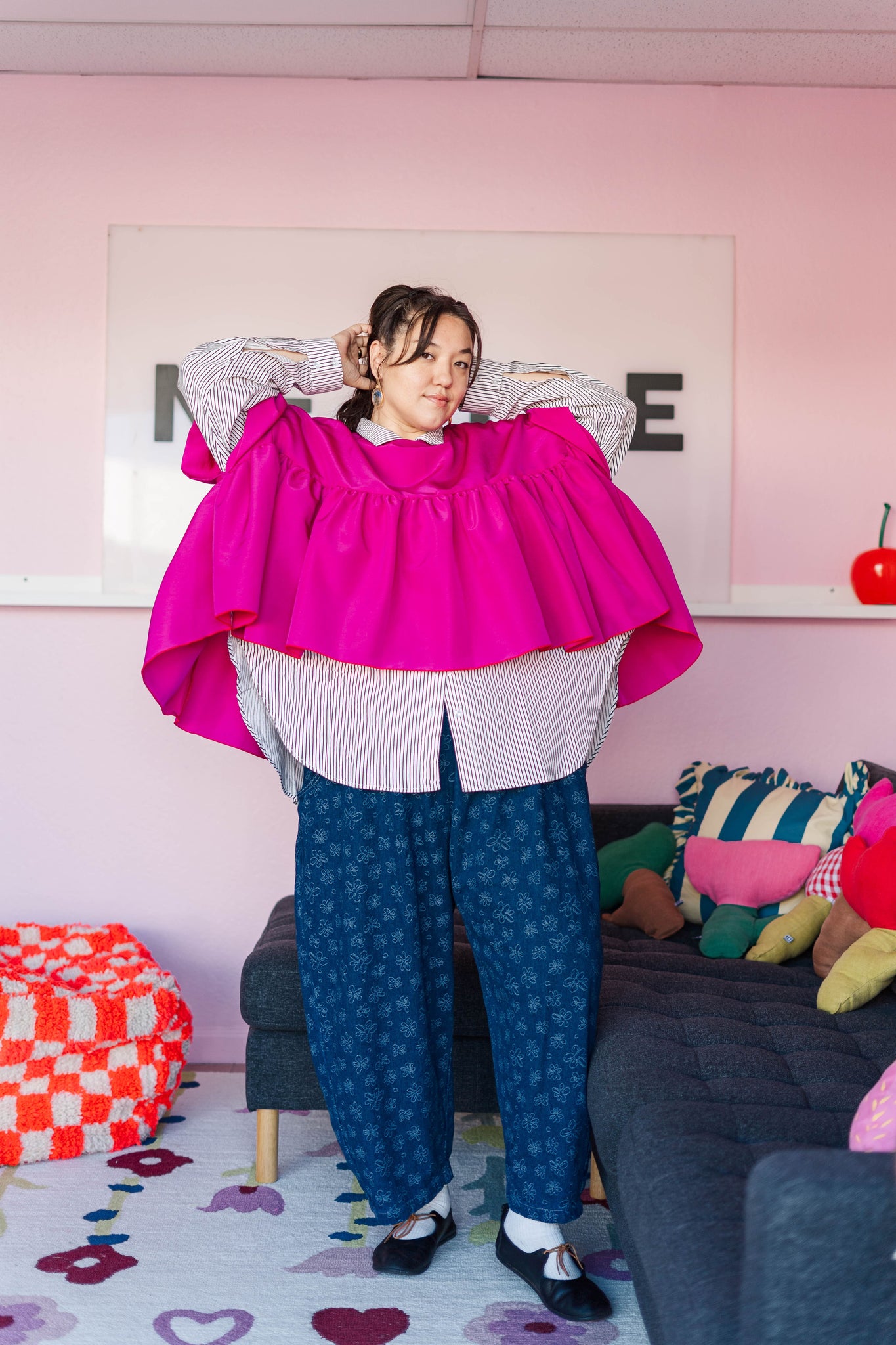 MODEL Angie (she/they) is 5’ 9.5” with a 33” inseam and measures 41.5” bust, 37” waist, and, and 41” hips.